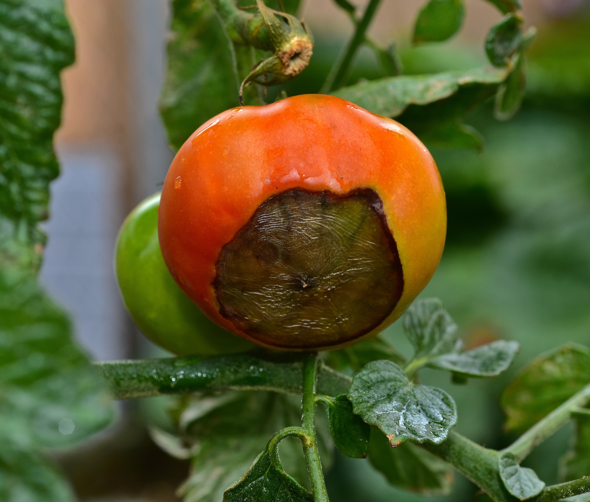 Die betroffenen Tomaten können so aussehen, als würden sie von der Spitze her verfaulen, wobei sich eine allmähliche Ausbreitung der Verfärbung zeigt, die die Qualität der Frucht negativ beeinflusst.