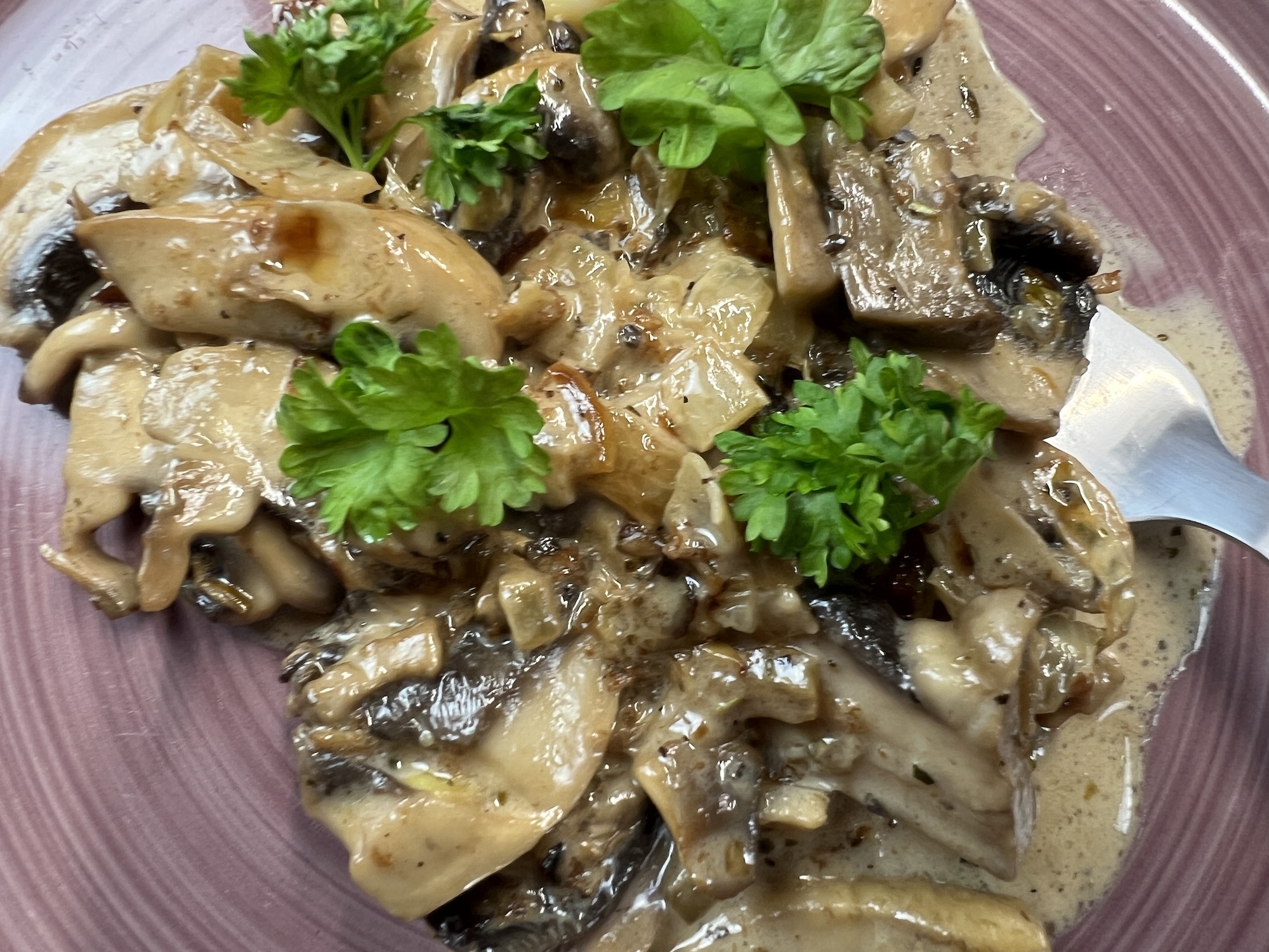 7. Nehme die Pfanne vom Herd und serviere die Champignon Rahm Pfanne sofort. Garniere sie mit frischer Petersilie und serviere sie heiß mit Beilagen wie Reis, Nudeln oder knusprigem Brot.