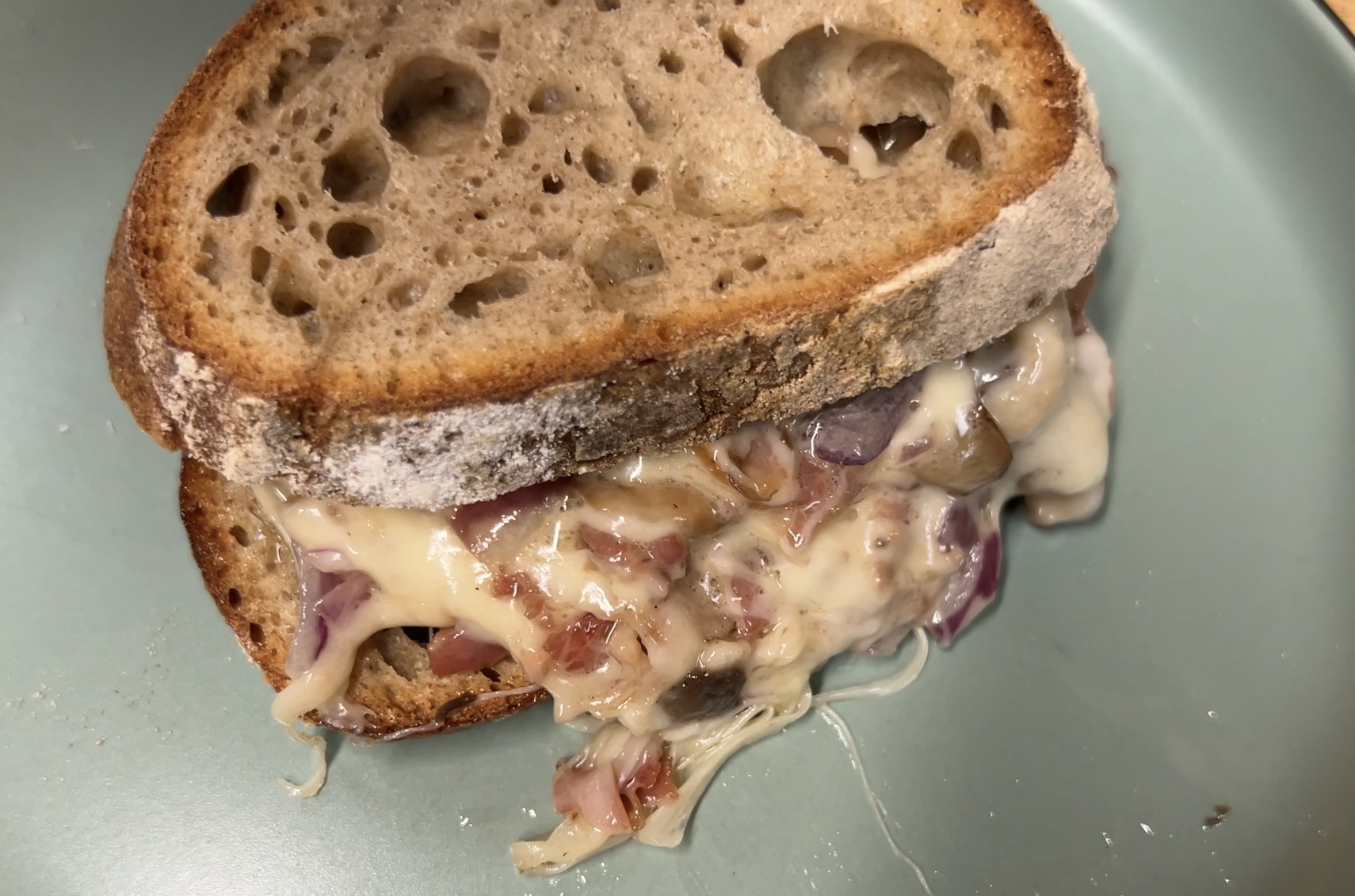 35. Überbackene Champignons mit Rucola-Pesto und Gruyère auf Roggenbrot