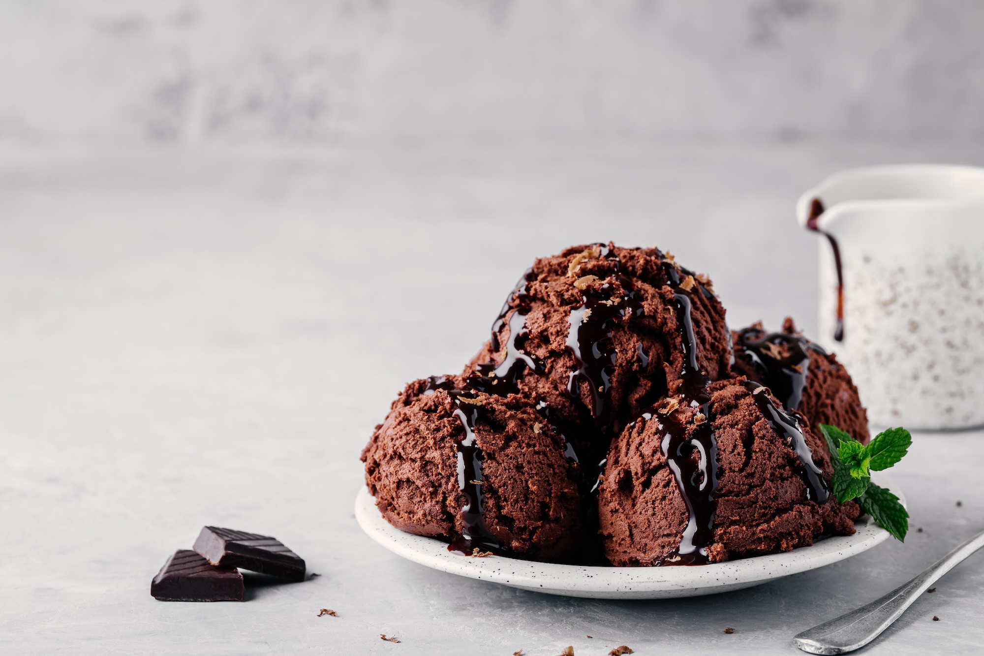 Dieses Eis, oft mit kleinen Brownie-Stückchen, ist in Kombination mit Schokoladensauce ein Traum aus Schokolade.