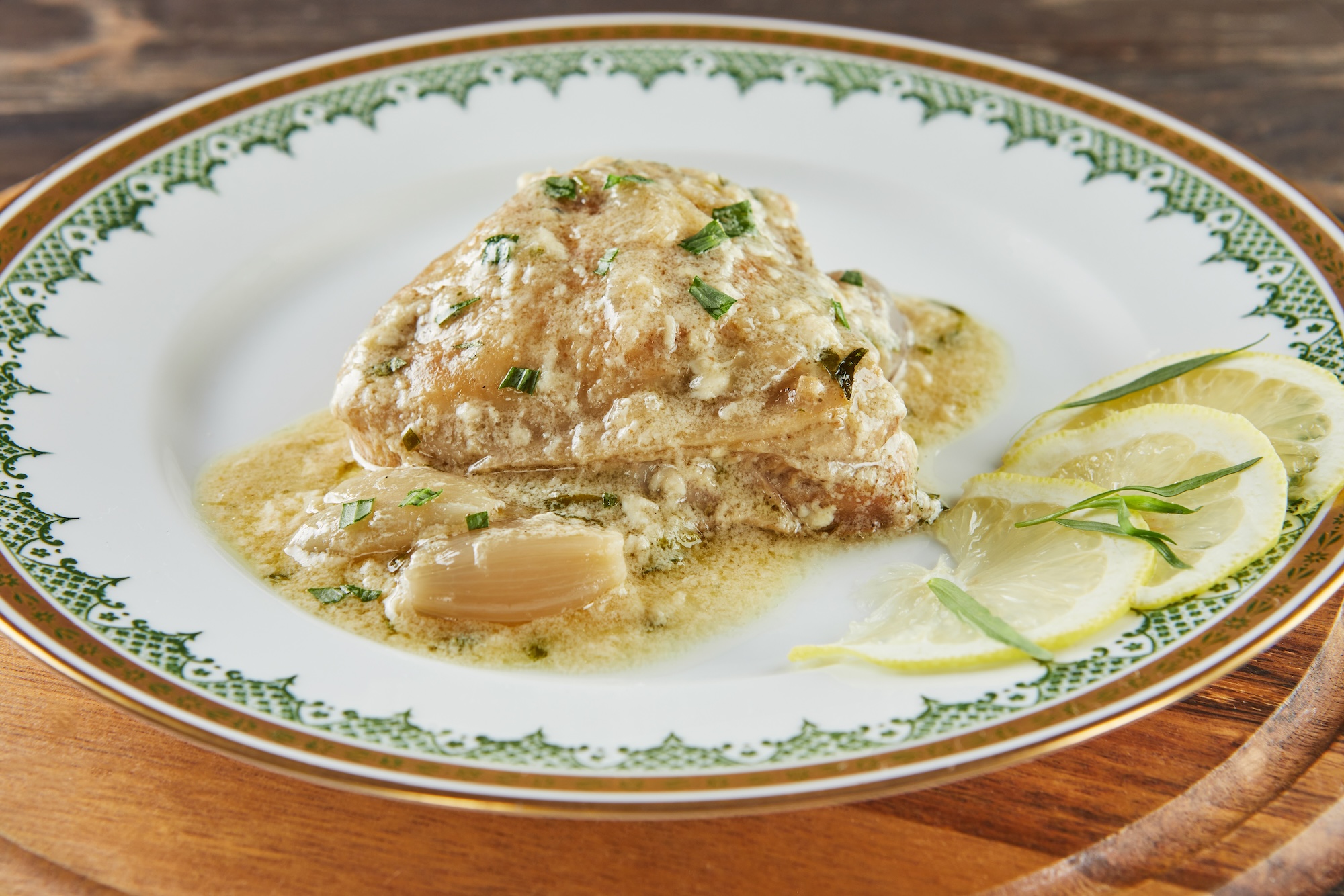 - Zitronenscheiben und frischer Estragon zum Garnieren