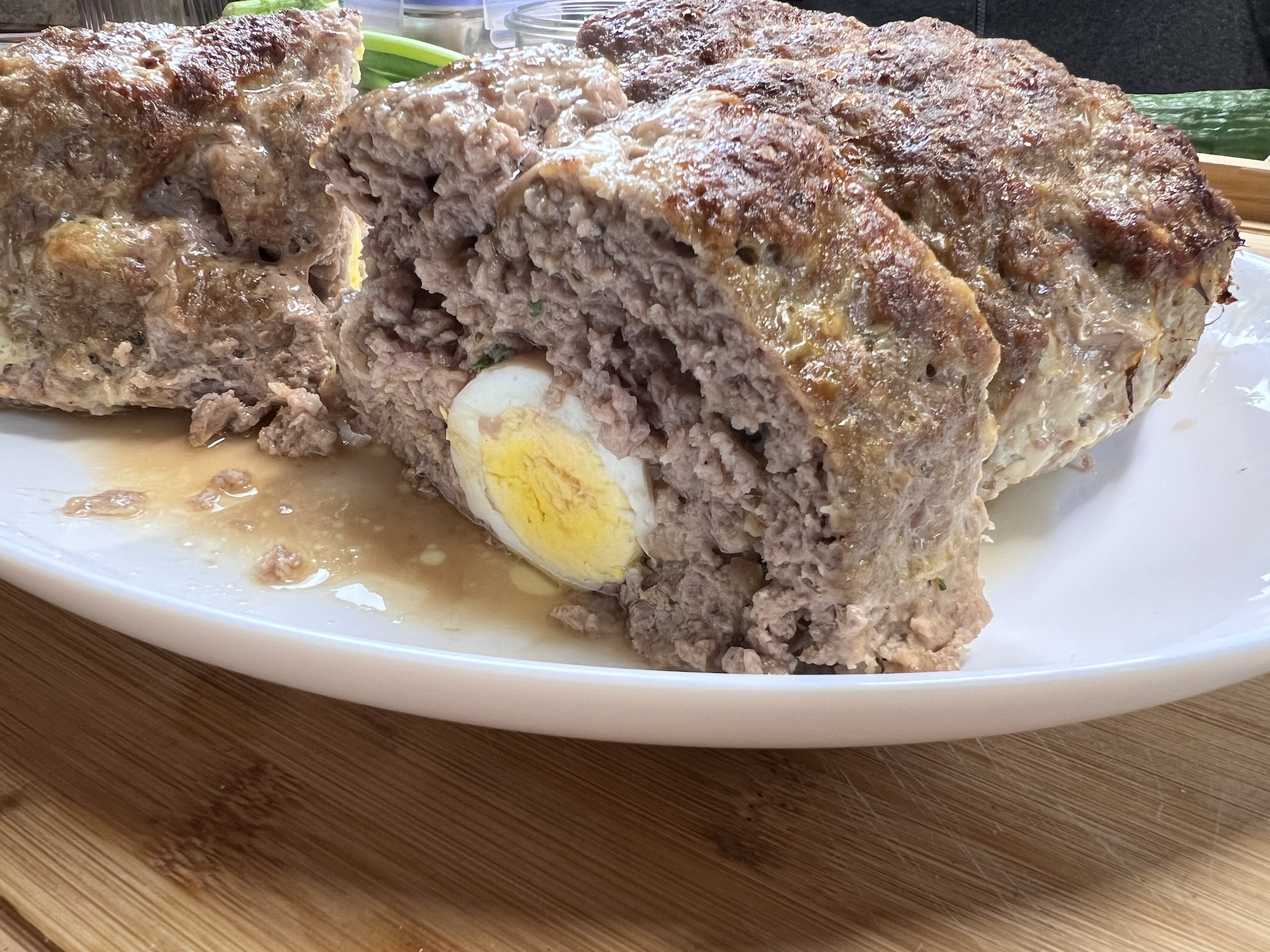 Der Hackbraten wird mit Eiern und traditionellen Zutaten zubereitet, die ihm eine wunderbare Würze verleihen.
