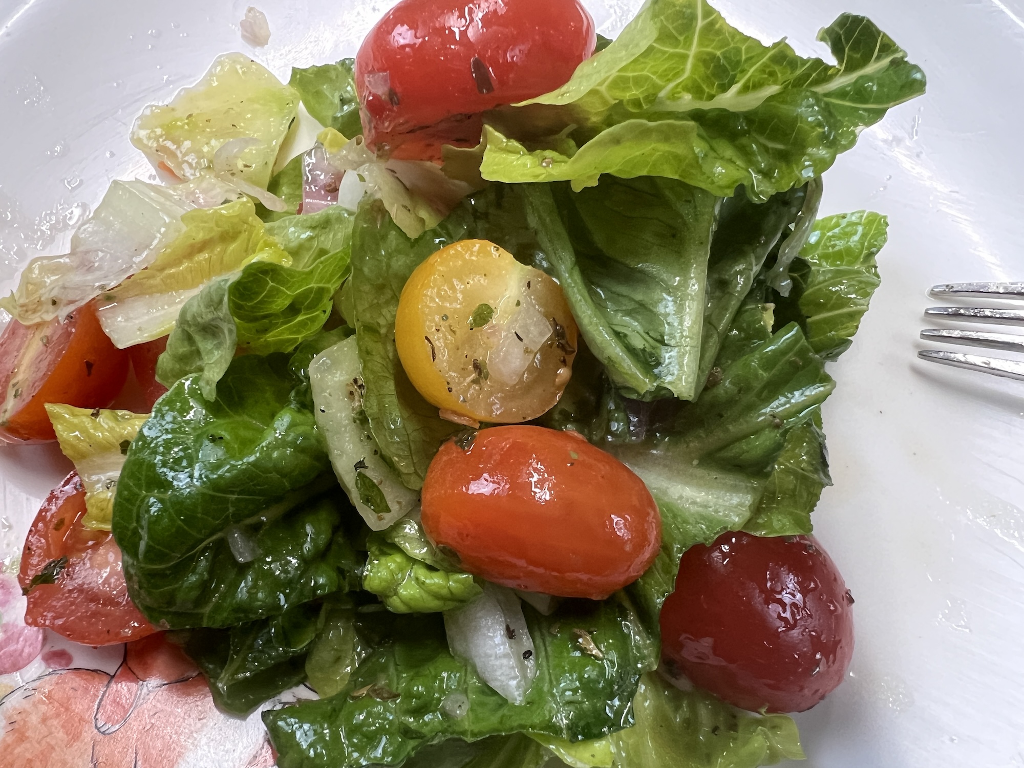 – 1 Kopf grüner Salat (z.B. Eisberg, Romana oder Batavia), gewaschen und in mundgerechte Stücke gezupft