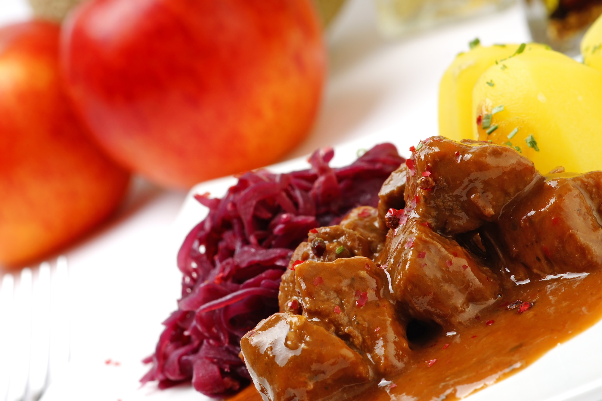- Das Gulasch mit den Kartoffeln und dem Rotkohl auf Tellern anrichten.