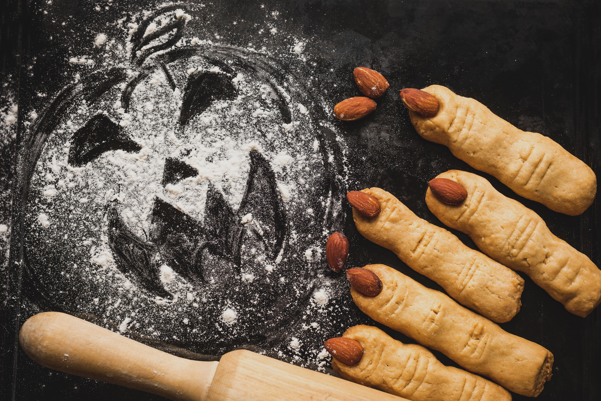 – Zubereitung: Butter, Zucker, Ei und Mehl zu einem Teig verarbeiten. Den Teig in fingerdicke Röllchen formen und an einem Ende Mandelblättchen als Fingernägel eindrücken. Die Kekse bei 180°C goldbraun backen. Etwas Erdbeermarmelade am anderen Ende der Kekse als “Blut” anbringen.