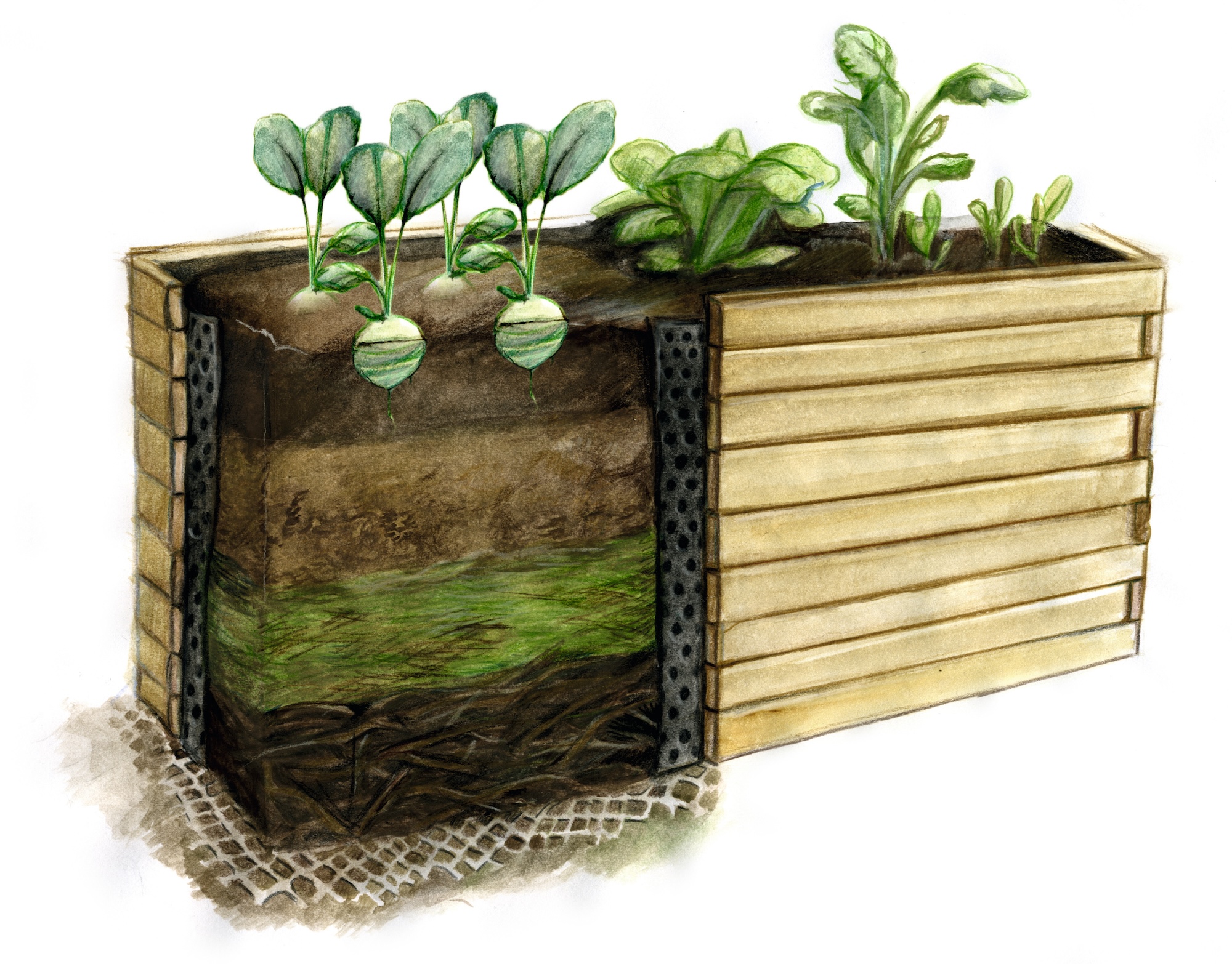 Hier ist eine typische Methode, um ein Hochbeet zu schichten: