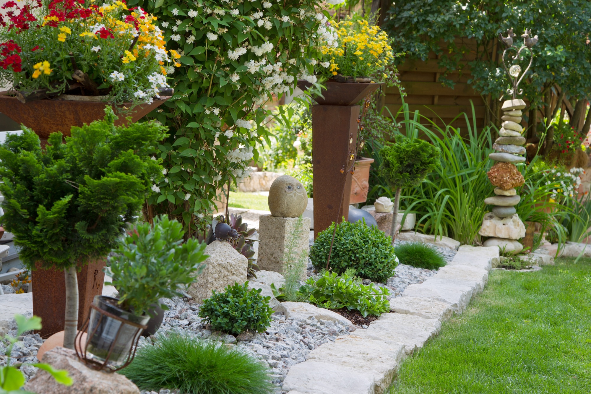 Dekoration: Weniger ist mehr. Wähle ein paar ausgewählte Stücke, die gut zum Stil passen und den Garten nicht überladen.
