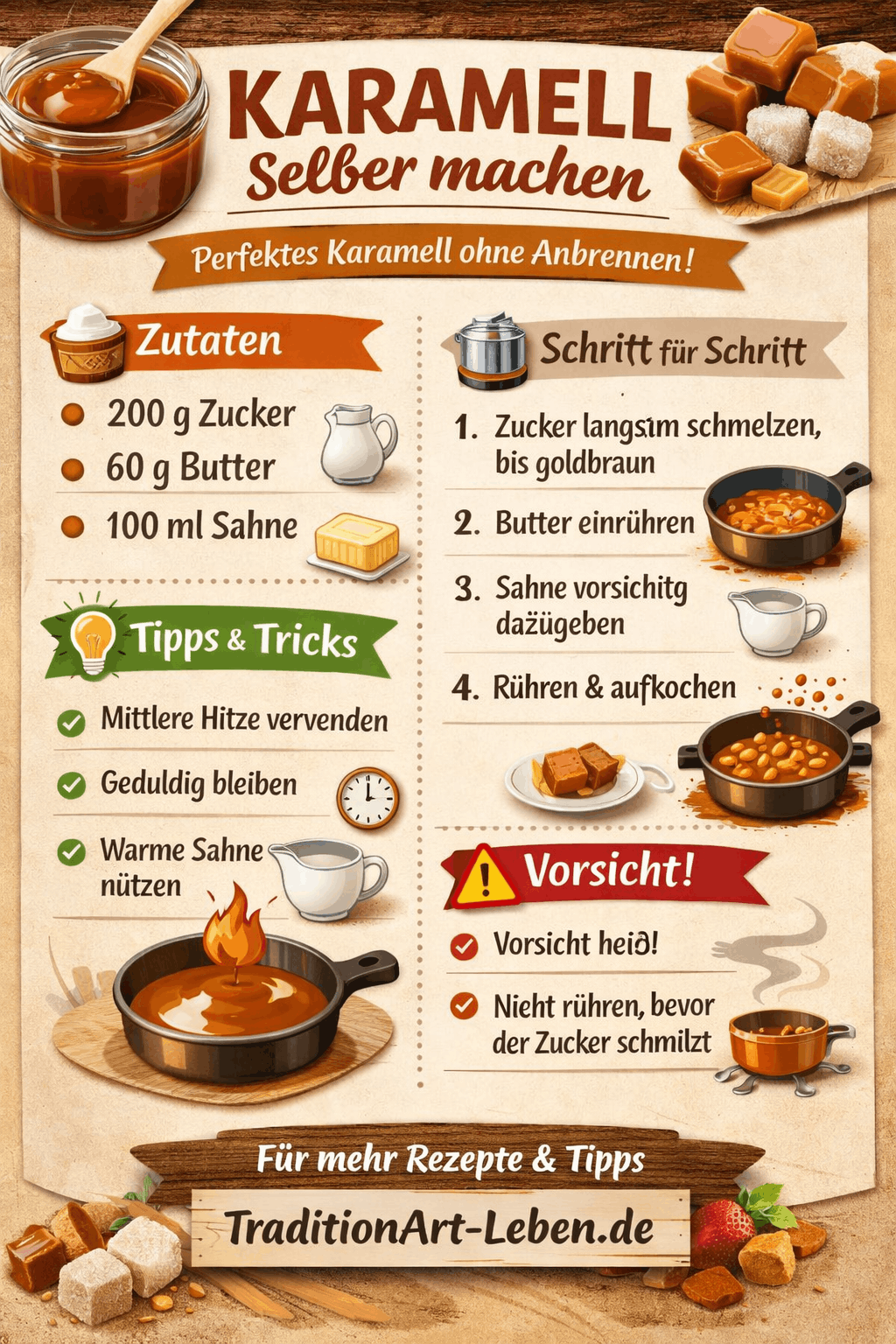 Perfektes Karamell gelingt, wenn man Zucker langsam schmilzt, Geduld hat, die Hitze kontrolliert und den richtigen Zeitpunkt abpasst, bevor der Zucker verbrennt.