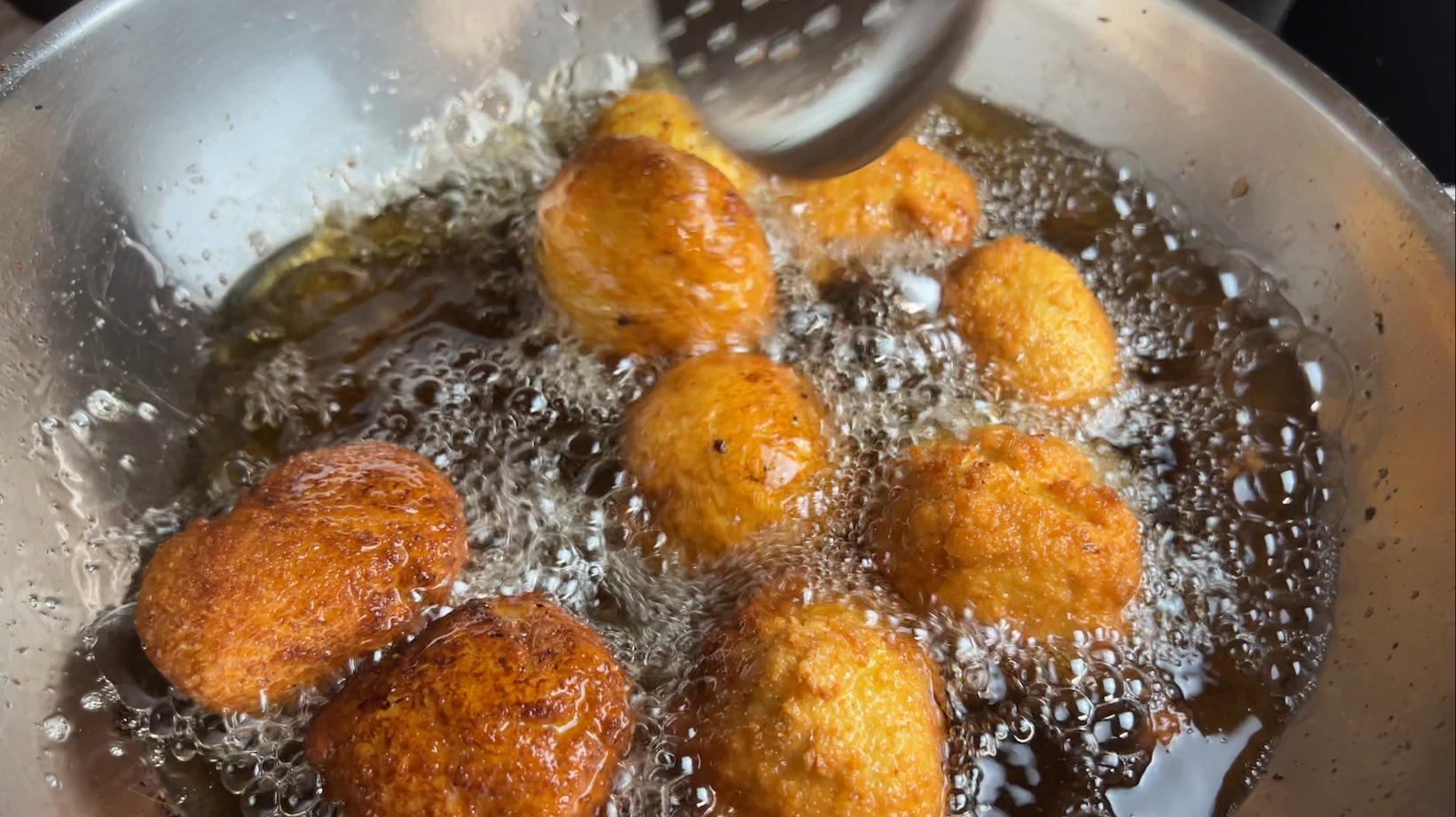 6. In einem Topf ausreichend Öl erhitzen, um die Bällchen zu frittieren. Das Öl sollte heiß genug sein, damit die Bällchen beim Hineingeben sofort anfangen zu brutzeln, aber nicht zu heiß, damit sie nicht verbrennen. Eine gute Temperatur liegt bei etwa 170-180°C.