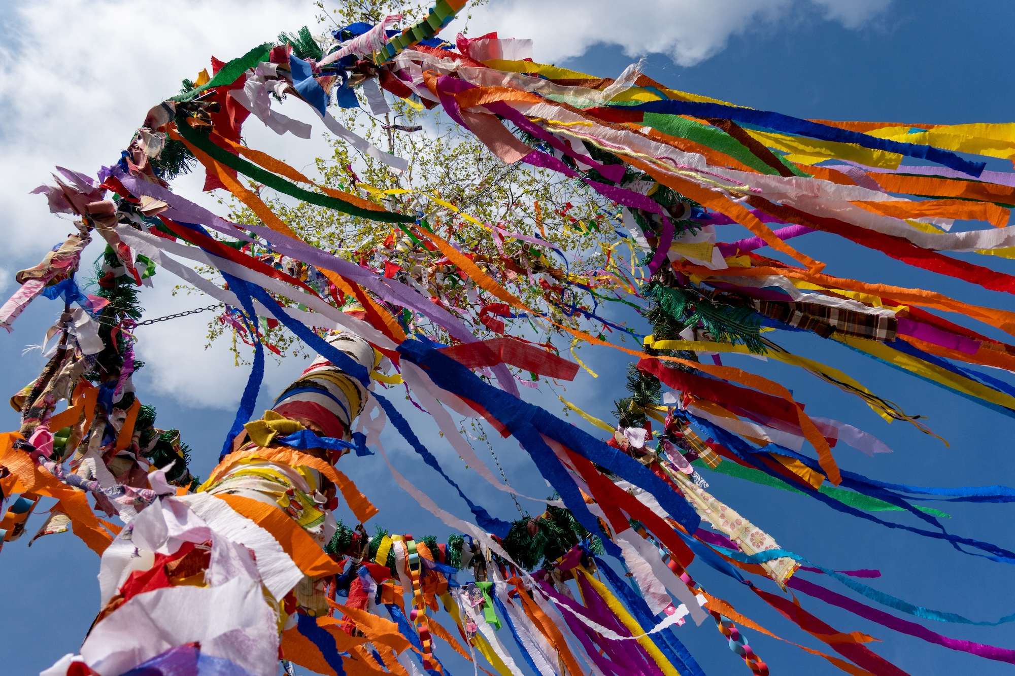 Grüne Bänder symbolisieren Hoffnung und Fruchtbarkeit, während rote für Liebe und Leidenschaft stehen. Gelb repräsentiert Licht und Lebensfreude. Die farbenfrohe Vielfalt spiegelt die Verbundenheit der Gemeinschaft wider.