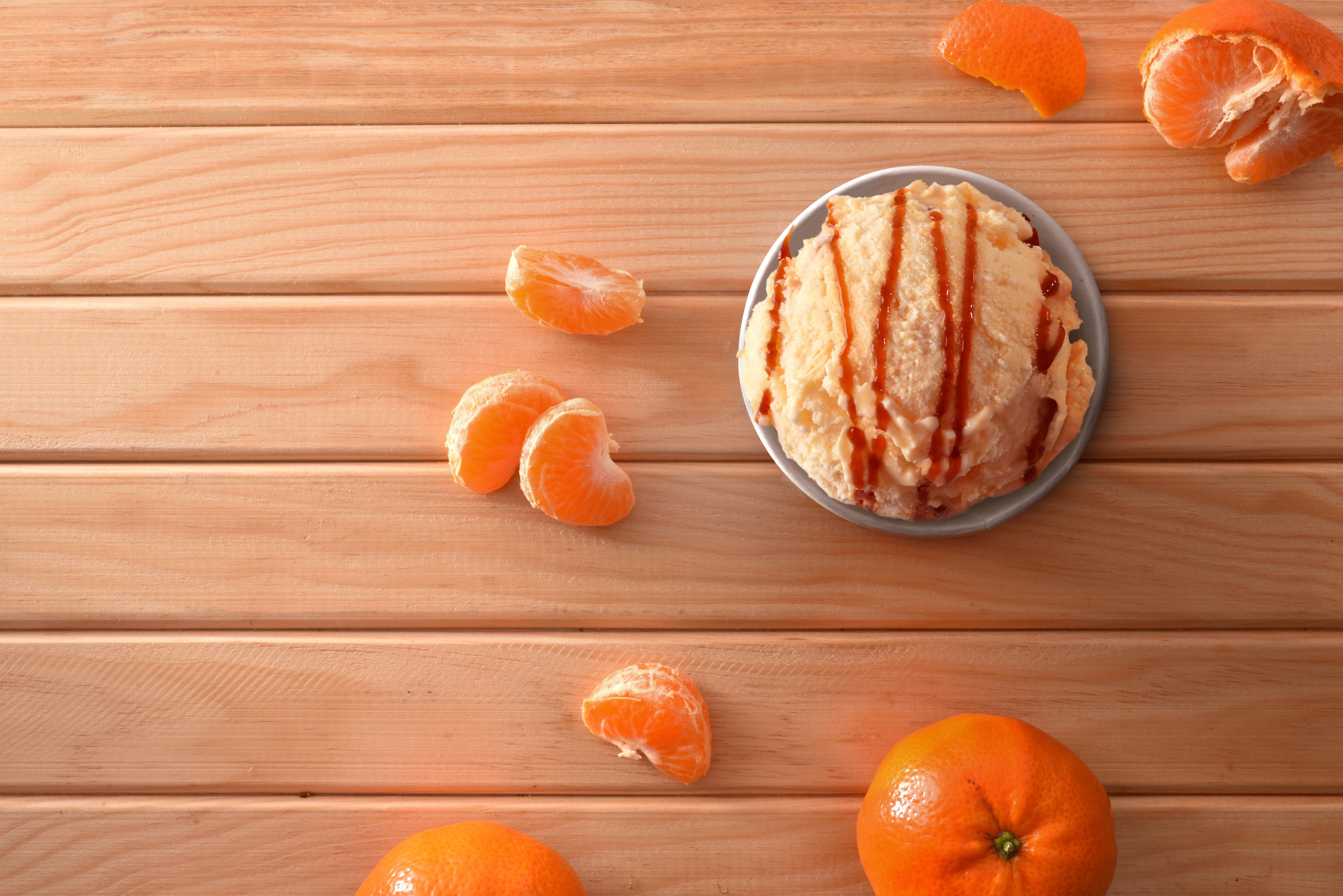 7. Servieren: Das Mandarinen-Eis aus dem Gefrierschrank nehmen und einige Minuten bei Raumtemperatur stehen lassen, bevor es serviert wird.