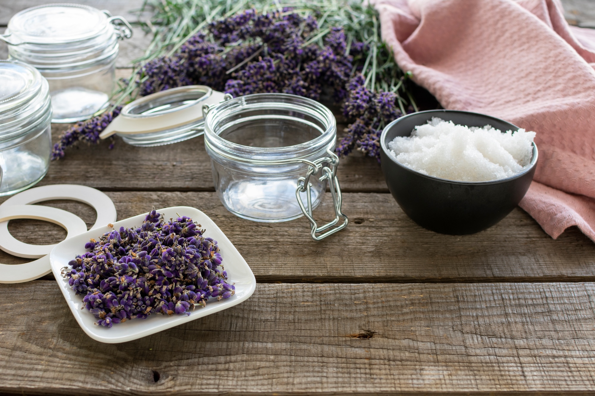 Man gibt ein halbes Kilo Badesalz (am besten aus dem Toten Meer) in ein Ein-Liter-Glas und fügt 100 g Lavendel hinzu, ebenso wie 35 g Trockenmilchpulver.