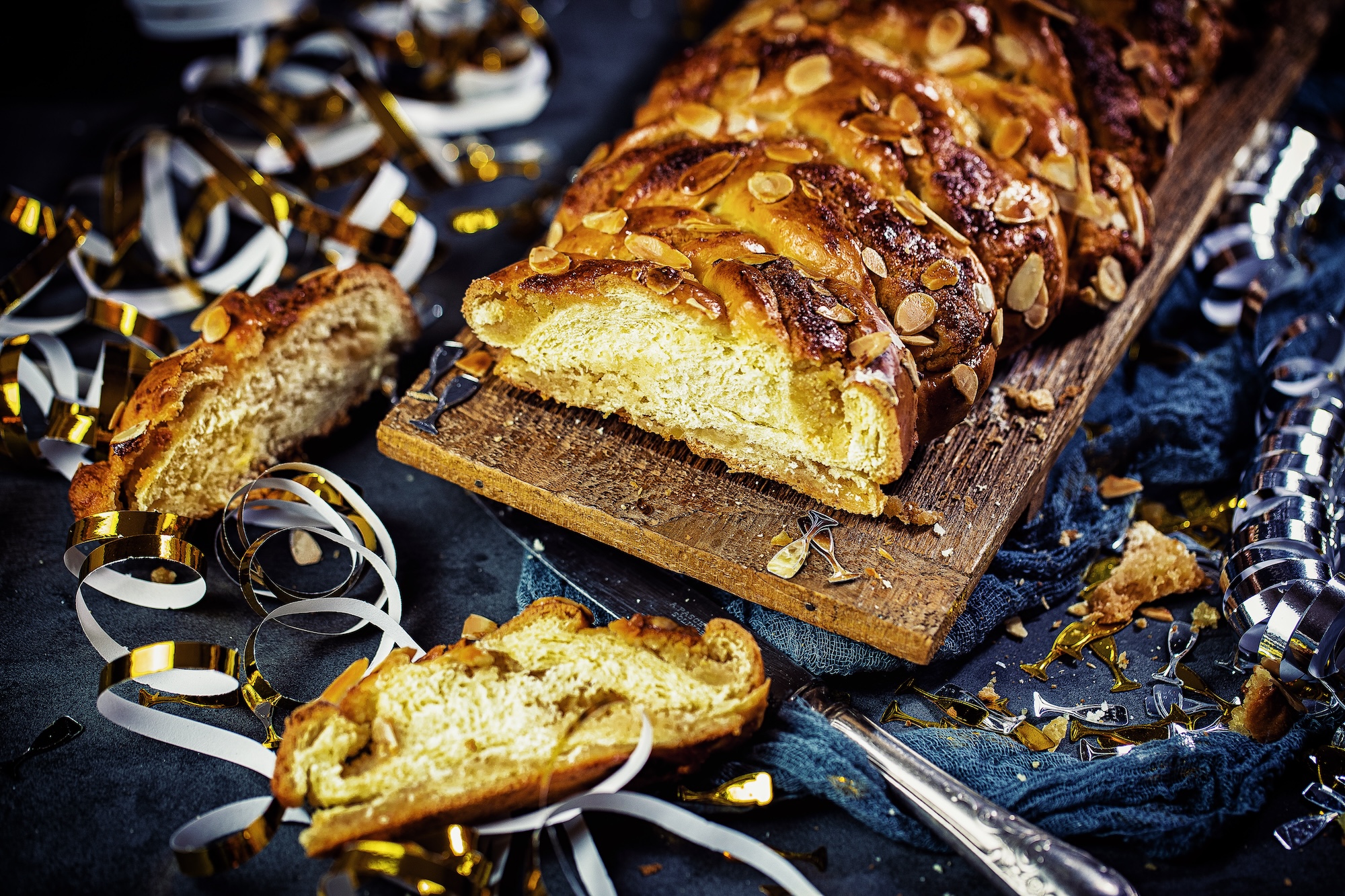 Der Neujahrszopf ist ein geflochtener Hefeteig, der häufig mit einer süßen Füllung aus Mandeln, Marzipan oder Früchten verfeinert wird.