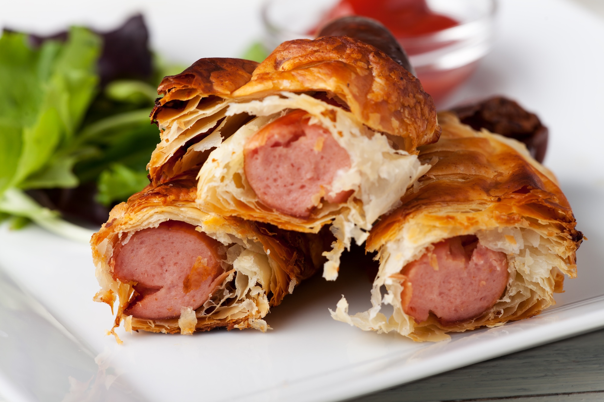 Ein klassischer, kinderliebling, der einfach und schnell zuzubereiten ist. Wickeln Sie kleine Würstchen in Blätterteig und backen Sie sie goldbraun.