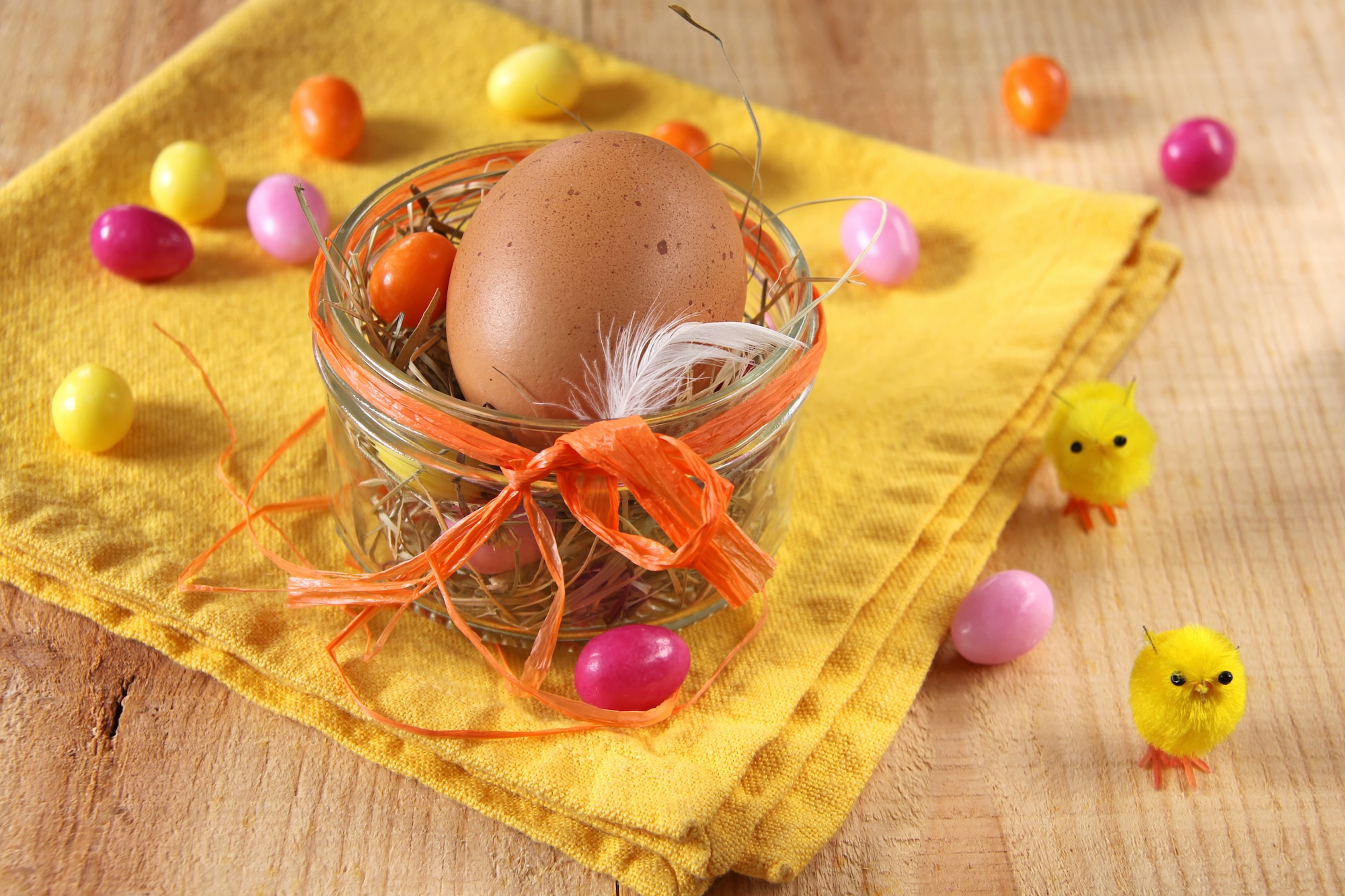 19. Oster-Bonbonniere im Glas: Dekoriere das Glas mit einem hübschen Stoff oder einer Banderole und fülle es dann mit kleinen Oster-Bonbons oder Pralinen. Das Glas kann als Geschenk oder Tischdekoration verwendet werden.