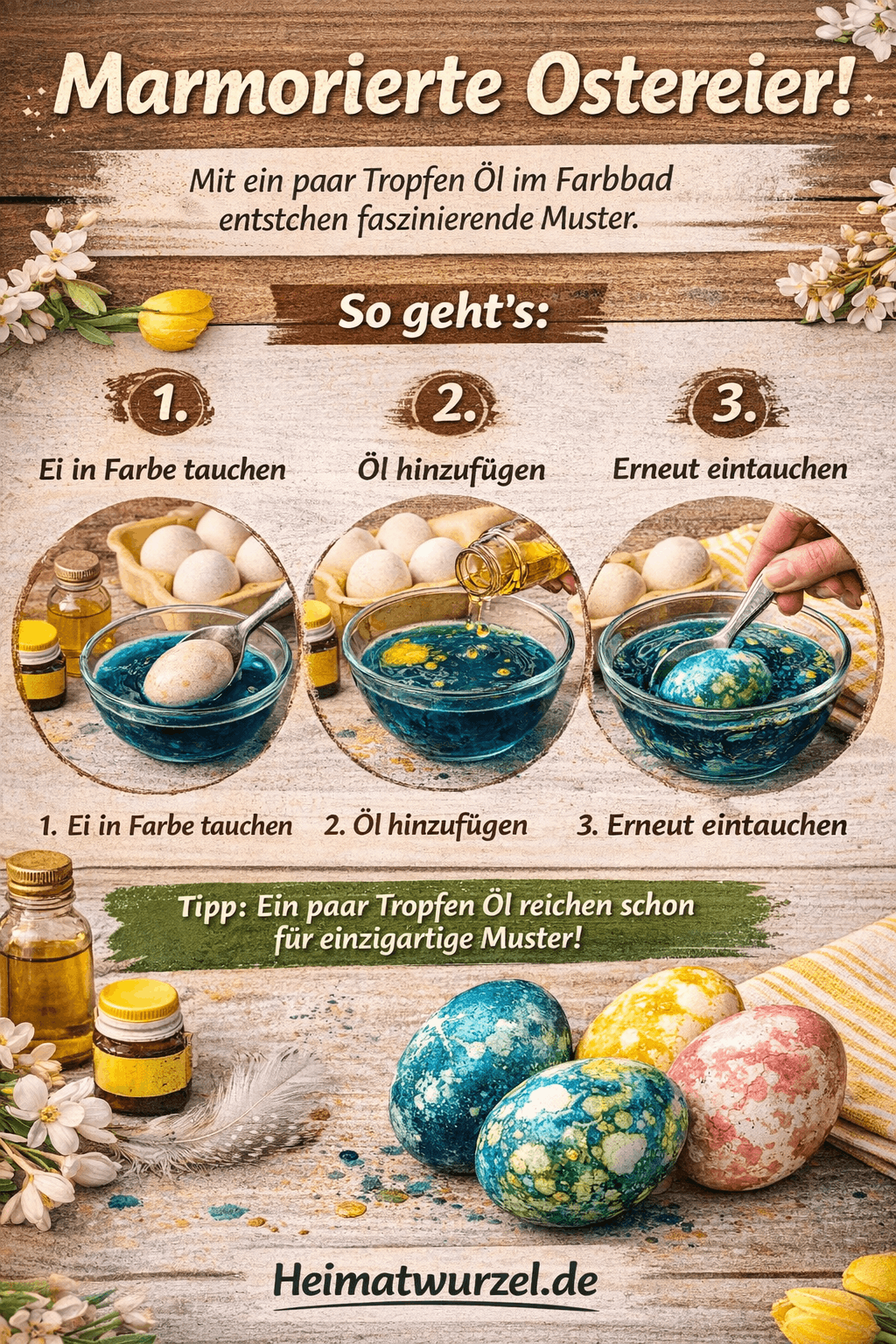 Nach dem Färben einfach mit ein paar Tropfen Speiseöl einreiben und polieren. Dadurch entsteht ein natürlicher Glanz und die Farben wirken intensiver.