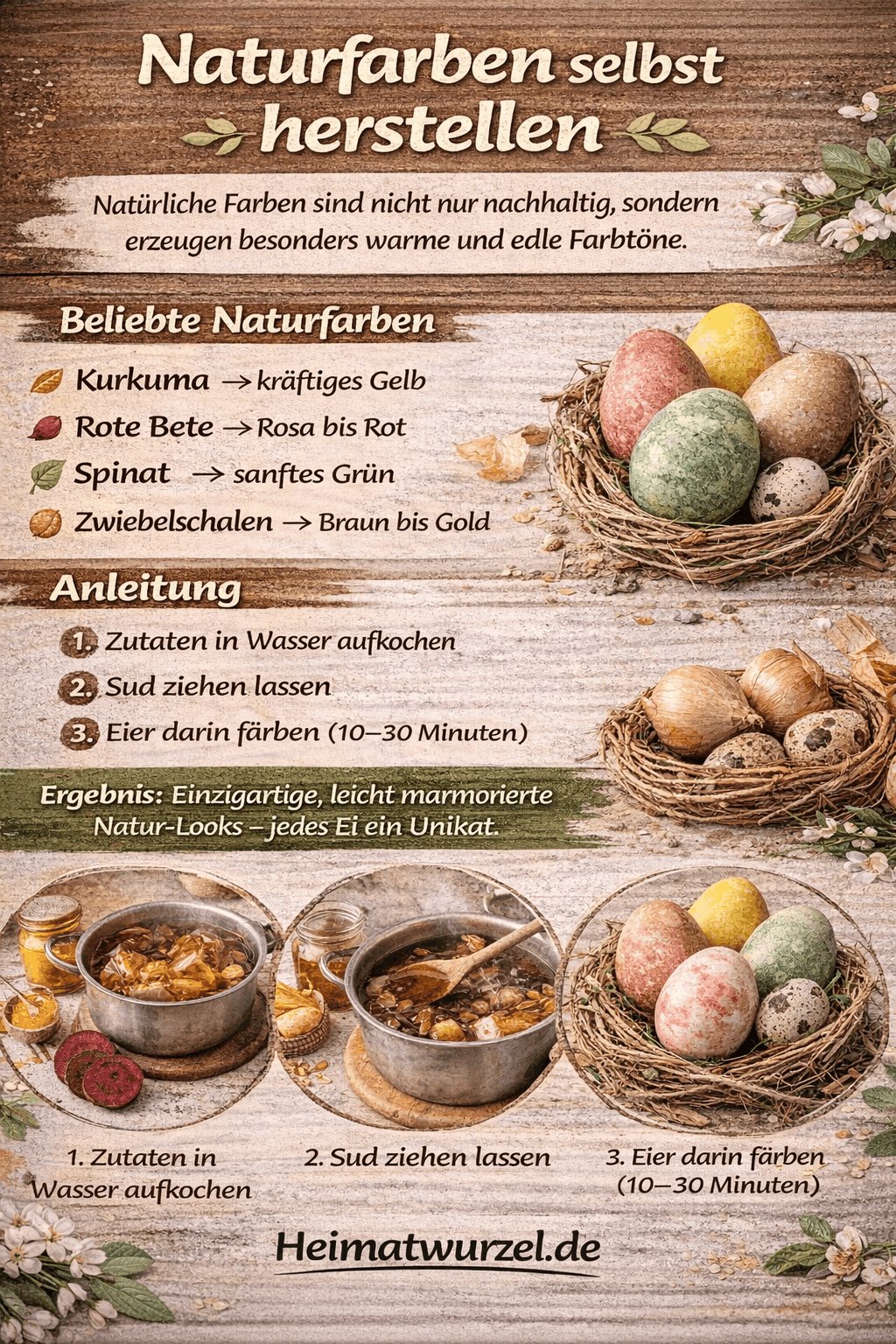 Ergebnis: Einzigartige, leicht marmorierte Natur-Looks – jedes Ei ein Unikat.