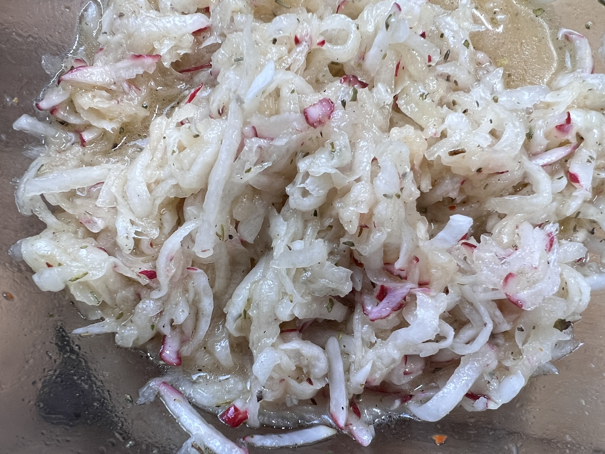 – In einer großen Schüssel die Rettich- und Radieschenscheiben mit den roten Zwiebelringen vermengen.