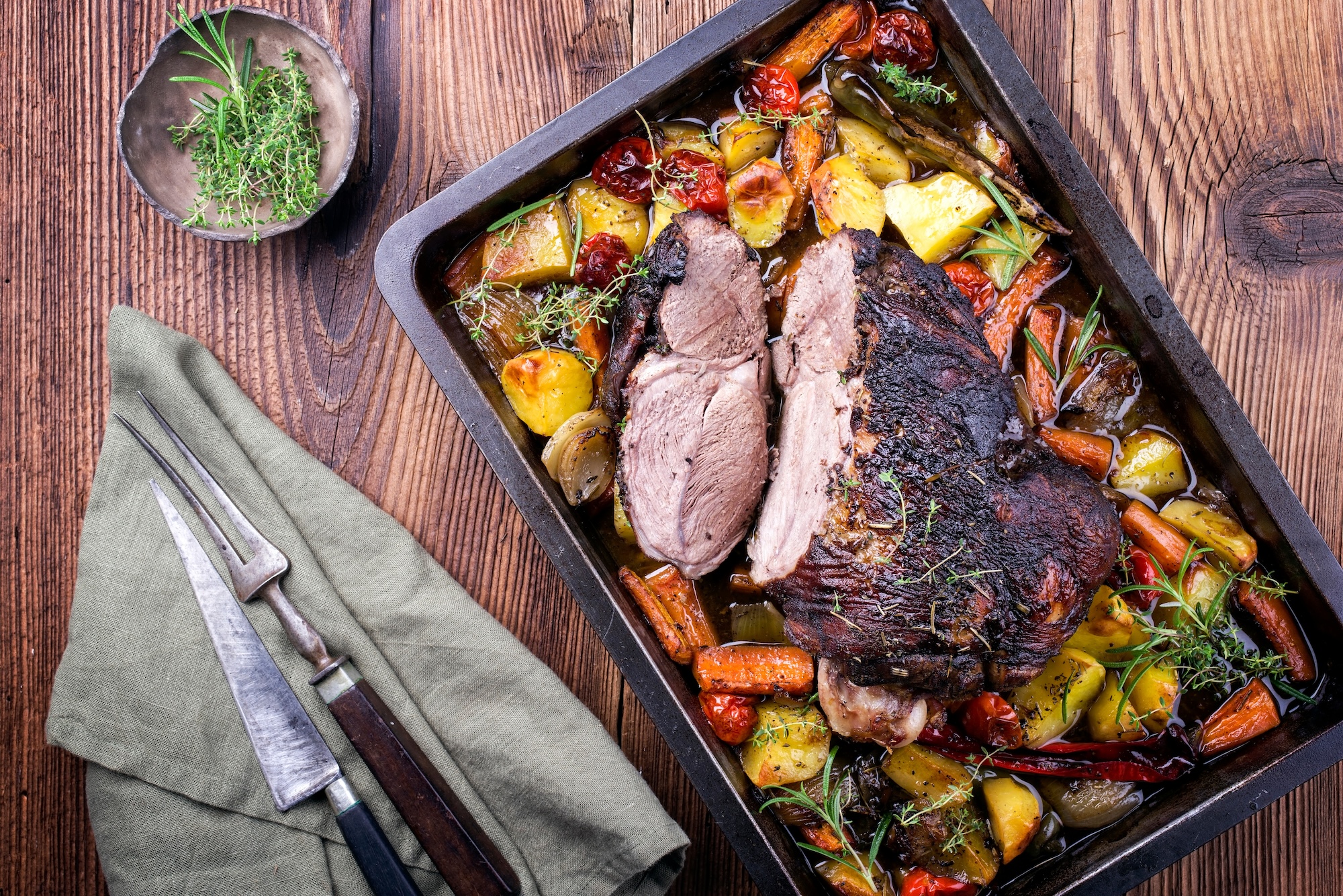 42. Lammkeule mit Rosmarin und Knoblauch: Eine klassische Ostermahlzeit! Brate eine Lammkeule mit frischem Rosmarin, Knoblauch und Olivenöl im Ofen, bis sie zart und saftig ist.