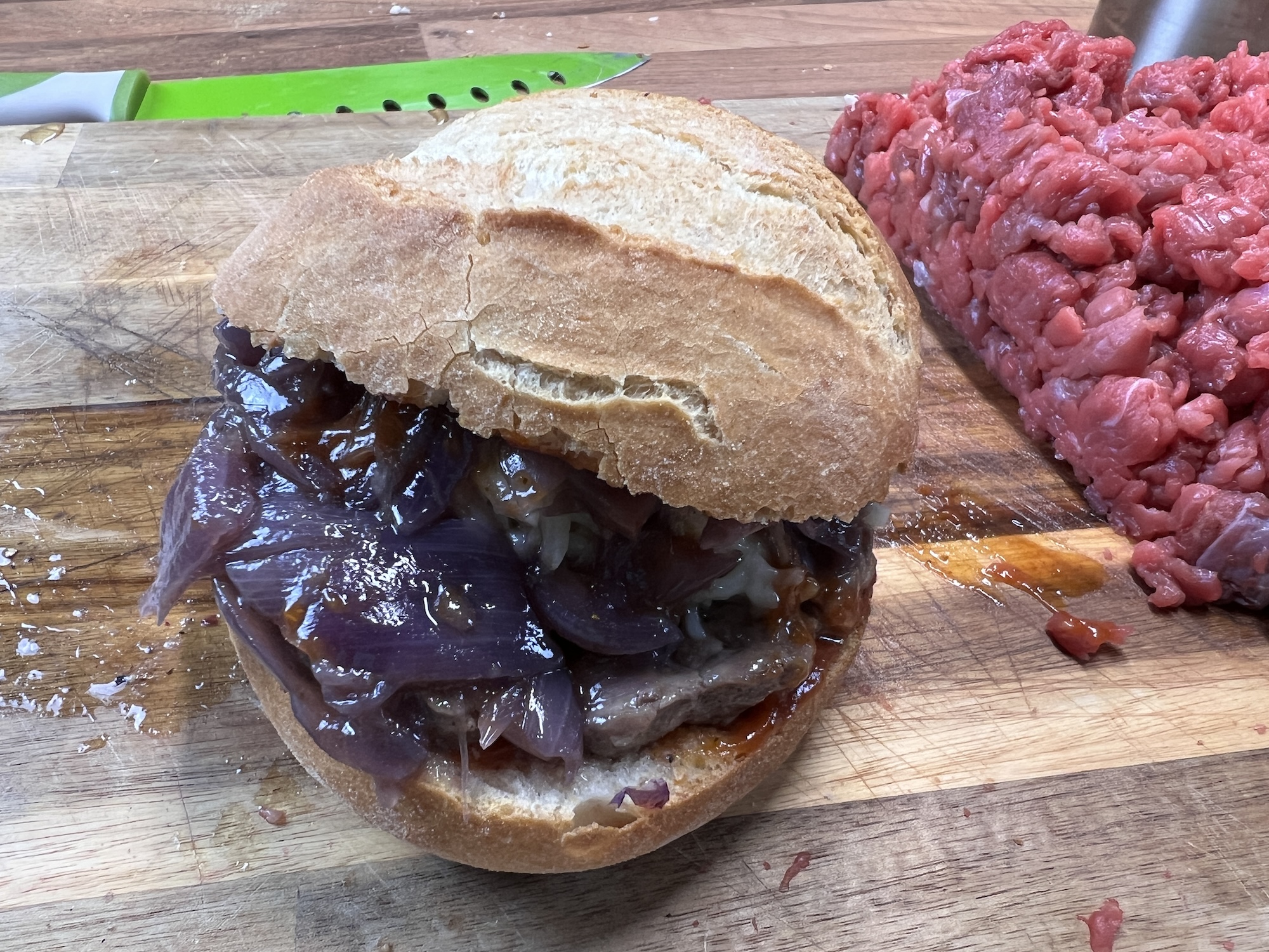 Roastbeef Burger mit Zwiebeln in Rotweinsauce