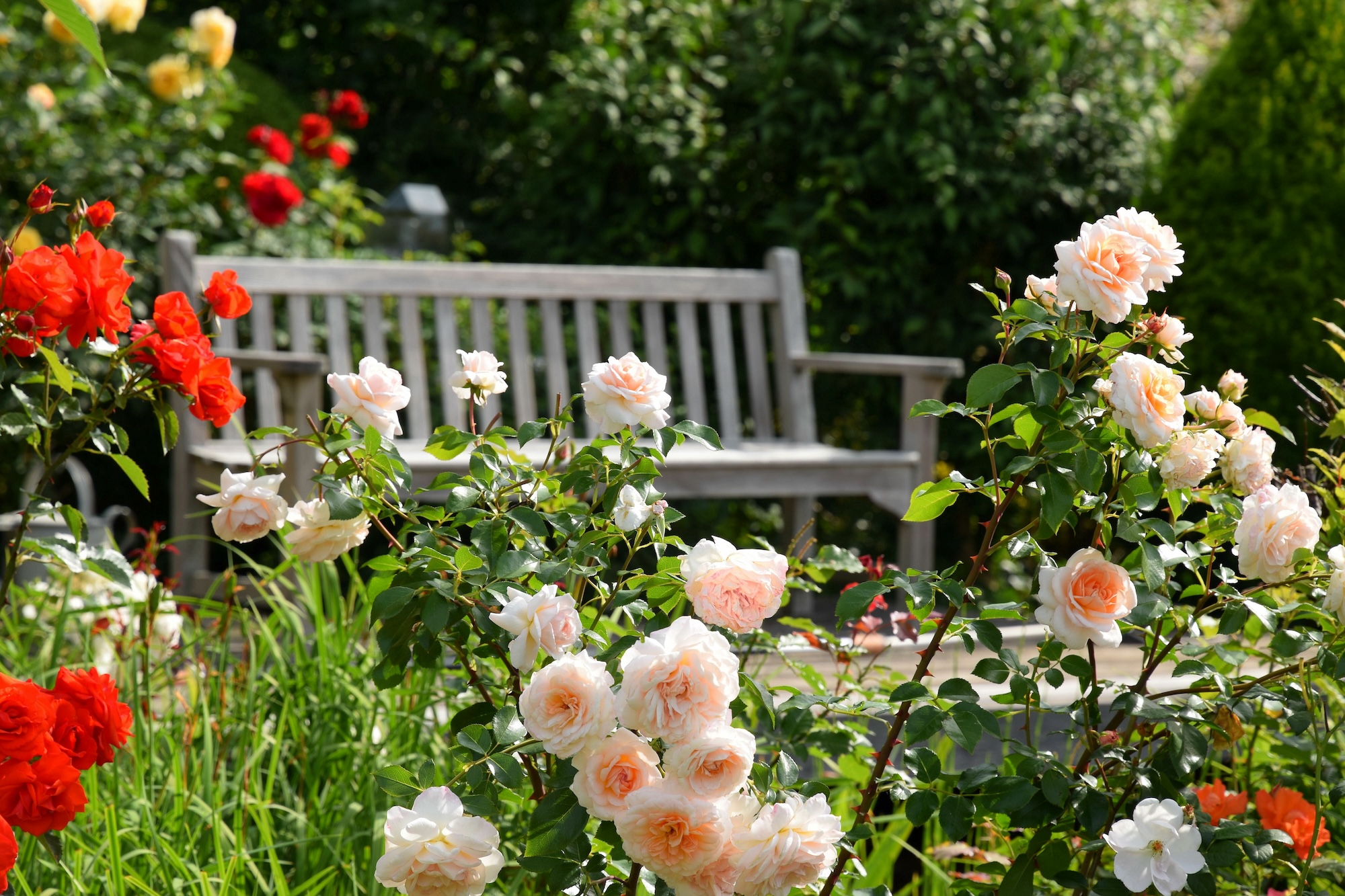In Romantikgärten wird eine große Vielfalt an Pflanzen verwendet, um das ganze Jahr über Interesse und Farbe zu bieten. Saisonale Blüten, mehrjährige Gewächse, schattige Baumgruppen und lebendige Sträucher schaffen eine dynamische Kulisse, die sich mit den Jahreszeiten verändert.