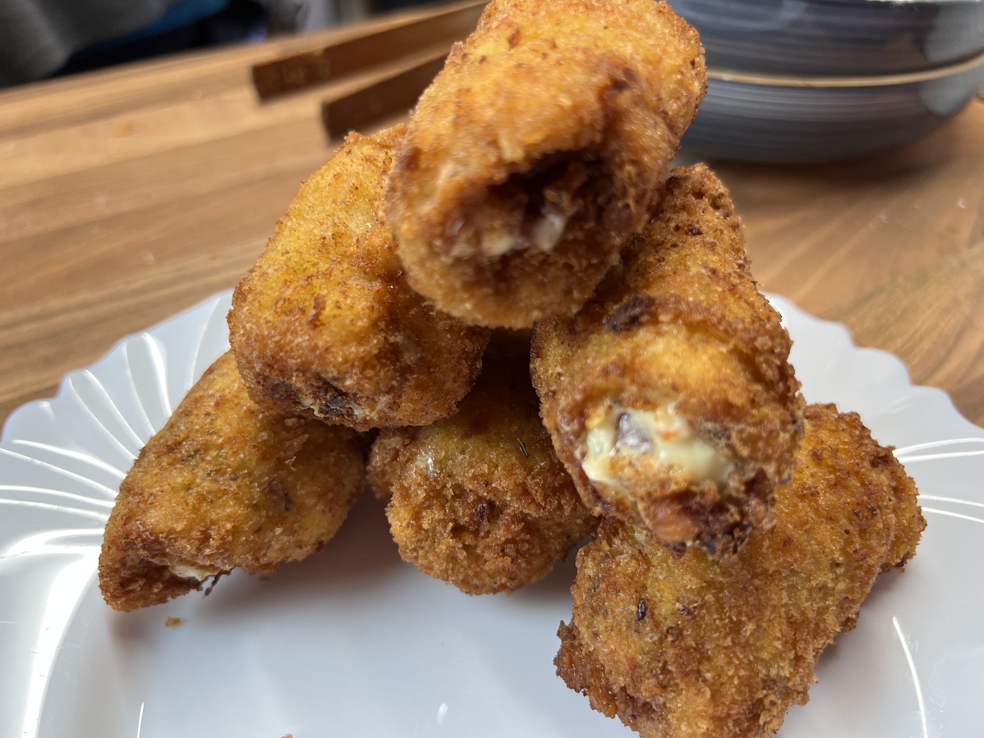 – Die Röllchen in Mehl, dann in verquirlten Eiern und schließlich in Semmelbröseln panieren.