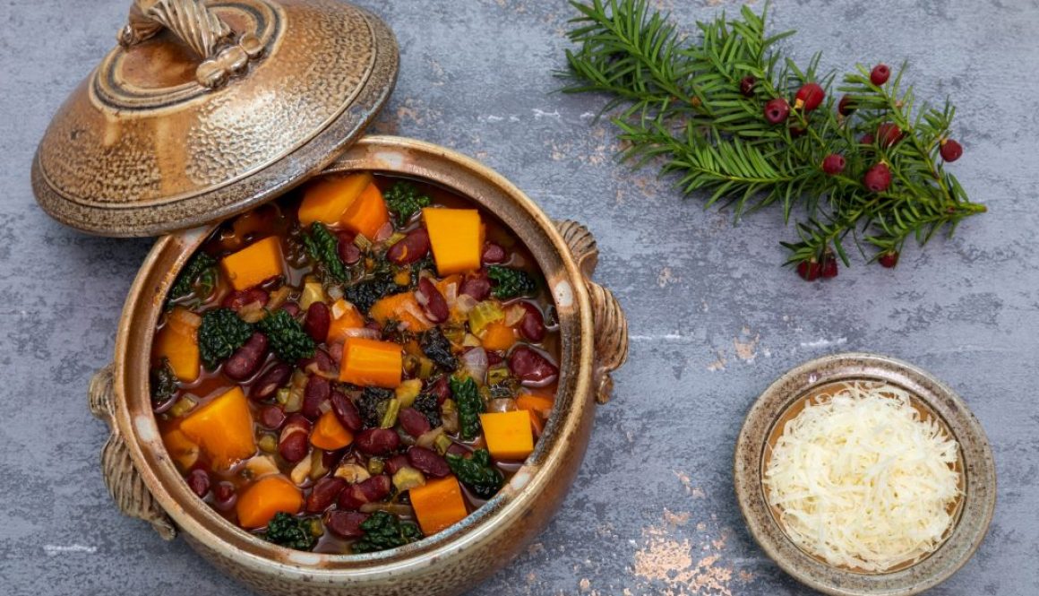 Bohneneintopf mit Kürbis Grünkohlblätter und Karotte