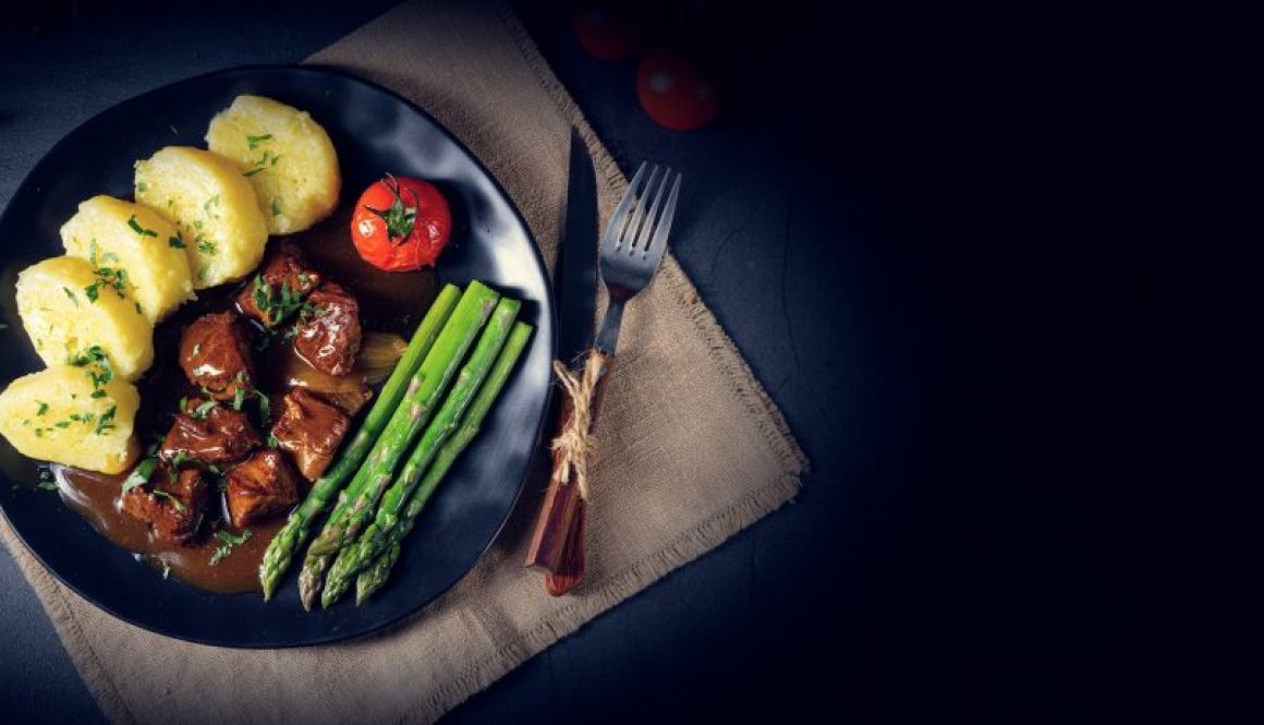 Knödel mit Rindergulasch und grünem Spargel