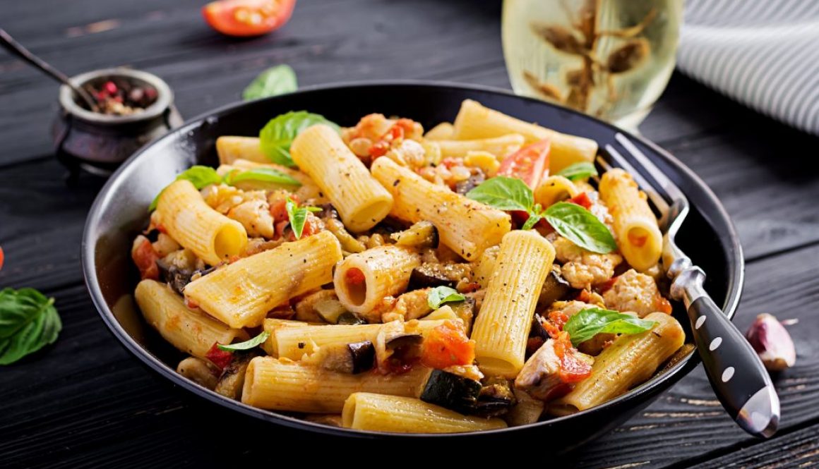 Rigatoni-Nudeln mit Hühnerfleisch, Auberginen in Tomatensauce