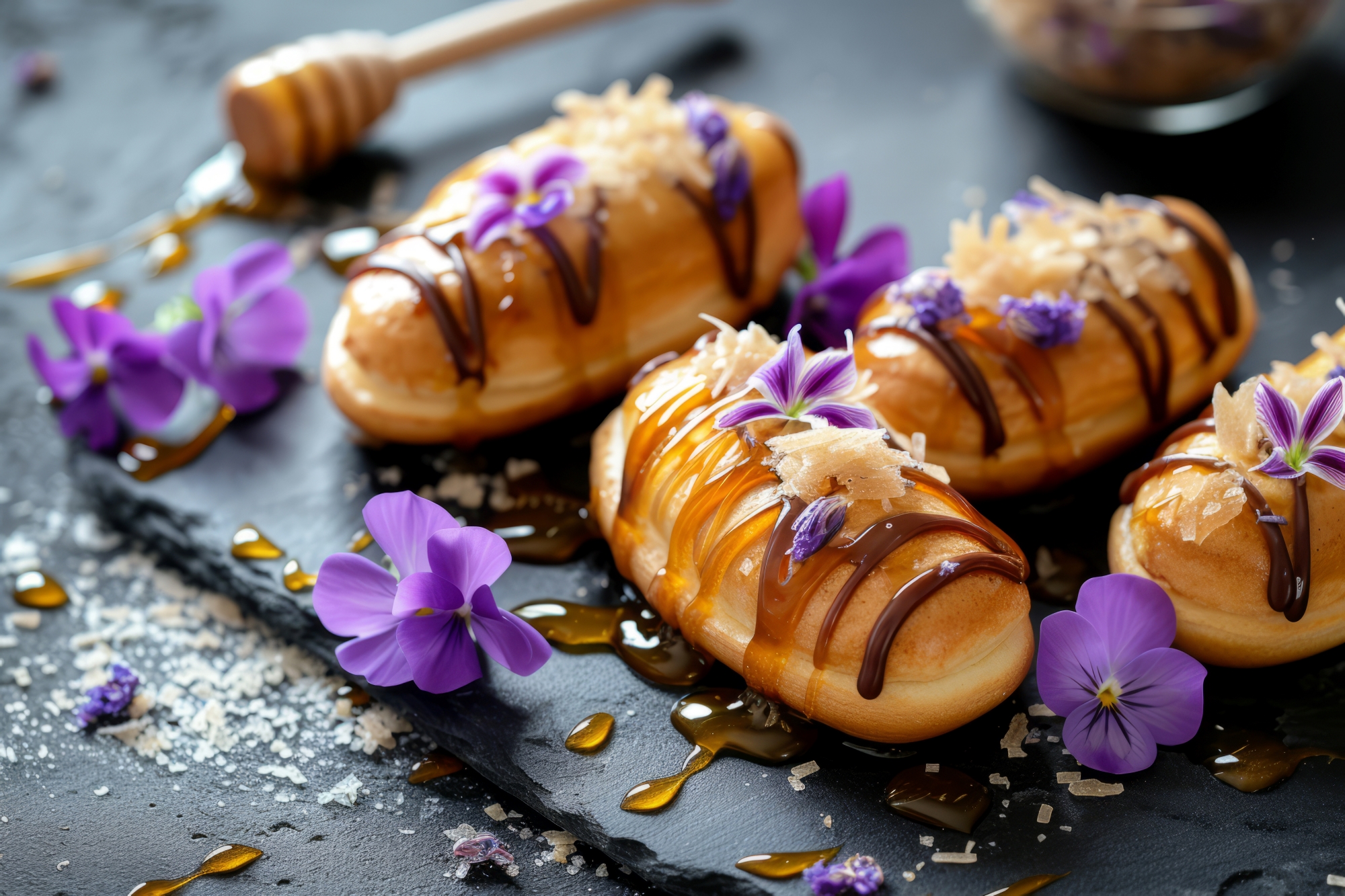 Eine exquisite Süßigkeit von Veilchen mit Schokolade kombiniert.